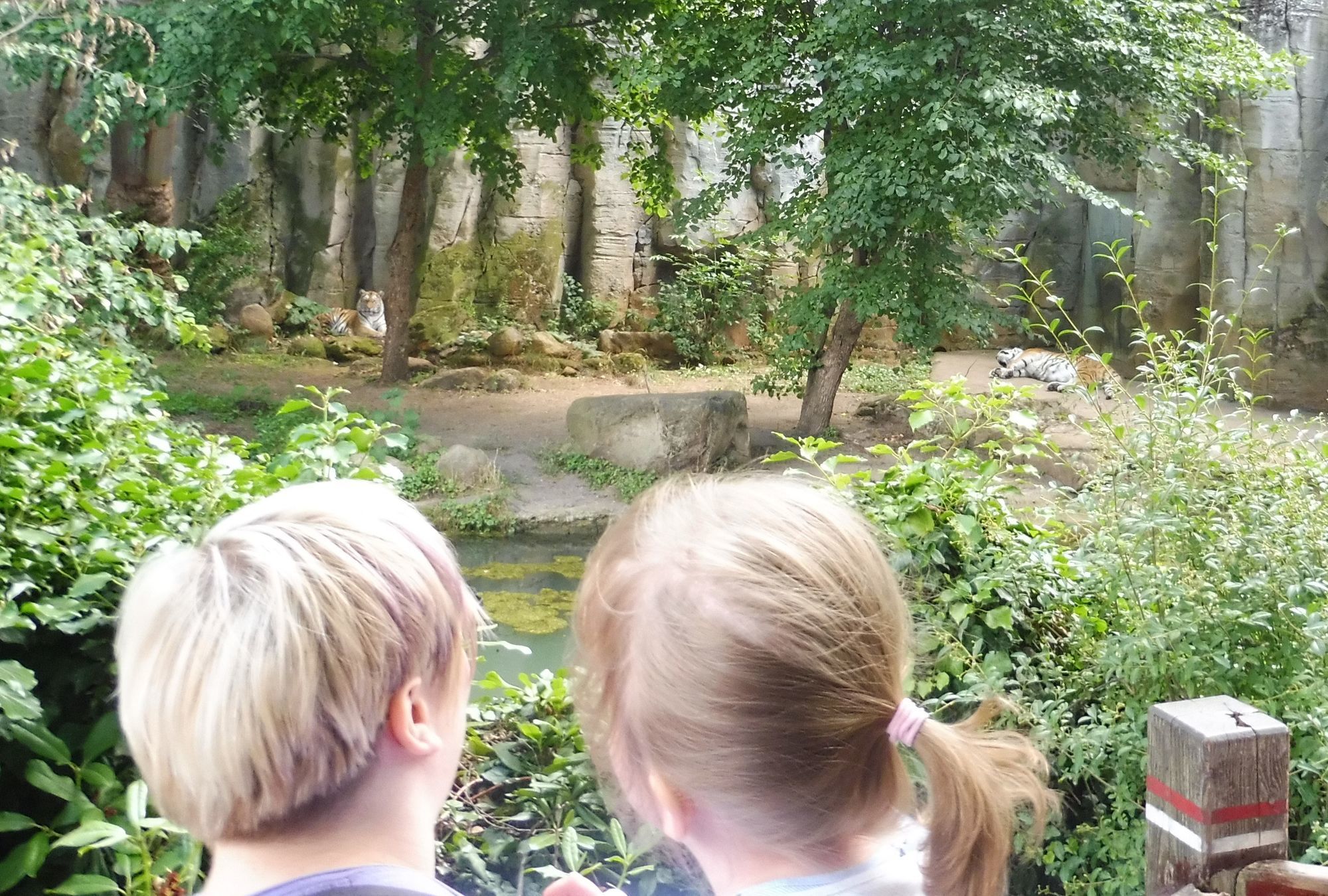 Los ging es dann gegen 9 Uhr mit der Tram. Eine kleine Reise mit 14 Kindern und 11 Erwachsenen kann schon eine Mammutaufgabe sein, welche sich aber lohnt! Im Zoo angekommen verzogen sich nun auch die restlichen Wolken, sodass alle einen sonnigen Start bei den Lippenbären hatten. Nach Seelöwen, kleinen Affen und jeder Menge singender Vögel, bestaunten die Kinder und ihre Begleiter die Amur-Tiger. Diese genossen ihr schattiges Plätzchen unter den Bäumen. Nach einer kleinen Stärkung in der Kiwara-Lounge, ging es weiter zu den Giraffen und anschließend in den Streichelzoo, wo die Tiere hautnah erlebt und gestreichelt werden konnten. Zum Schluss bestanuten alle noch die Nashörner und Flamingos, welche im Wasser gerade ein Bad nahmen. Die Kinder genossen diesen aufregenden und spannenden Tag sehr und staunten nicht schlecht, wie viele unterschiedliche, kleine und große, bunte und interessante Tiere es doch gibt.