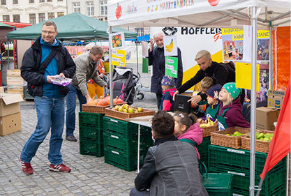 Im Oktober war es dann soweit. Dank liebevoller Organisation seitens der Projektleitung von Hr. Gärthe, durften einige Kinder auf dem Wochenmarkt in Leipzig zuvor spielerisch Gelerntes in die reale Lebenswelt übertragen. Die Kinder übten sich in echten marktschreierischen Fähigkeiten, verkauftes echtes essbares Obst und Gemüse, wechselten Kleingeldbeträge und wünschten allen einen schönen Tag.