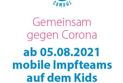Ab Donnerstag, den 05. August sind die mobilen Impfteams auch bei uns auf dem Kids Campus zu finden und stehen zu folgenden Terminen in der Zeit von 9.00 bis 16.00 Uhr (bzw. solange Impfstoff vorhanden ist) für Erst- und Zeitimpfungstermine zur Verfügung: