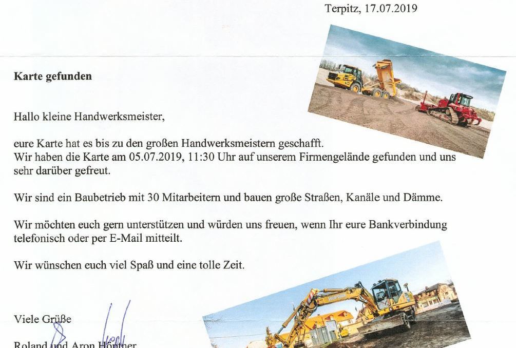 Unsere Kinder und das Team der Kita „Kleine Handwerksmeister“ staunten nicht schlecht, als vor einigen Tag Post ins Haus flatterte. Nachdem sie am 05.05. Helium-Ballons mit selbstbemalten Kärtchen in den Himmel steigen ließen, ahnten sie sicherlich noch nicht wie weit es einige schaffen würden und was sie bewirken. Ein Ballon flog bis nach Decin/ Tschechien und wurde von einem Hund gefunden. Seine Besitzerin schickte die Karte mit lieben Grüßen zurück. Ein zweiter Ballon landete in Terpitz/ Nordsachsen bei der Firma Höptner Strassen- und Tiefbau GmbH. Begeistert vom Konzept unserer Kita, gestalteten die Geschäftsführer einen sehr freundlichen Brief mit Fotos der Belegschaft und boten unseren kleinen Handwerksmeistern finanzielle Unterstützung an. Toll – wie aus kleinen Aktionen etwas so Schönes entstehen kann. Vielen Dank!