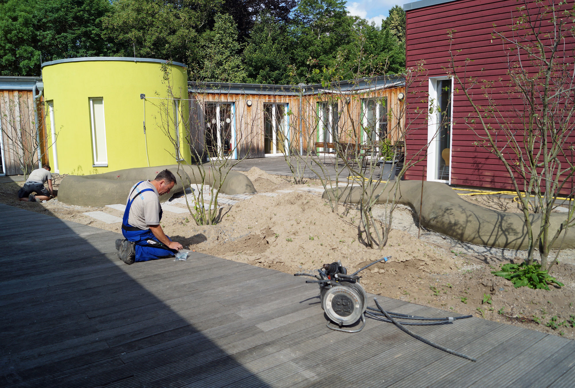 Seit Mitte April 2017 wird mit Hochdruck an den Umbauten des Innenhofes der Kita Sankt Georg gearbeitet. Bei der Neugestaltung des Innenhofes gingen die Eltern mit gutem Beispiel voran und bereiteten den Boden für die herannahenden Bauarbeiten vor. Auch der Erlös des zweimal im Jahr stattfindenden Kuchenbasars wurde für den Zweck der Umbauarbeiten gespendet. Nun können die Kinder bald auch bei heißen Temperaturen den Hof nutzen, denn viele Bäume bieten dann die Möglichkeit im Schatten zu spielen. „Im Sommer konnten wir uns im Hof nicht aufhalten, denn die Hitze hat sich gestaut wie in einem Kessel.“, sagt Kathrin Heidenreich, stellvertretende Leiterin der Kita. Eine große mit Mosaiksteinen geflieste Schlange, in die eine Bewässerungsanlage und ein Wasserbecken integriert sind, werden dafür sorgen, das Klima im Innenhof zu verbessern und heiße Temperaturen werden für die Kinder am kühlen Nass erträglich. Unterm Strich kostet die Baumaßnahme dem Städtischen Eigenbetrieb Behindertenhilfe stolze 60.000 Euro. Doch auch der Förderverein Kindertagesstätte Sankt Georg e.V unterstützt die Neugestaltung mit der Kostenübernahme für die Bäume im Wert von 4.500 Euro.