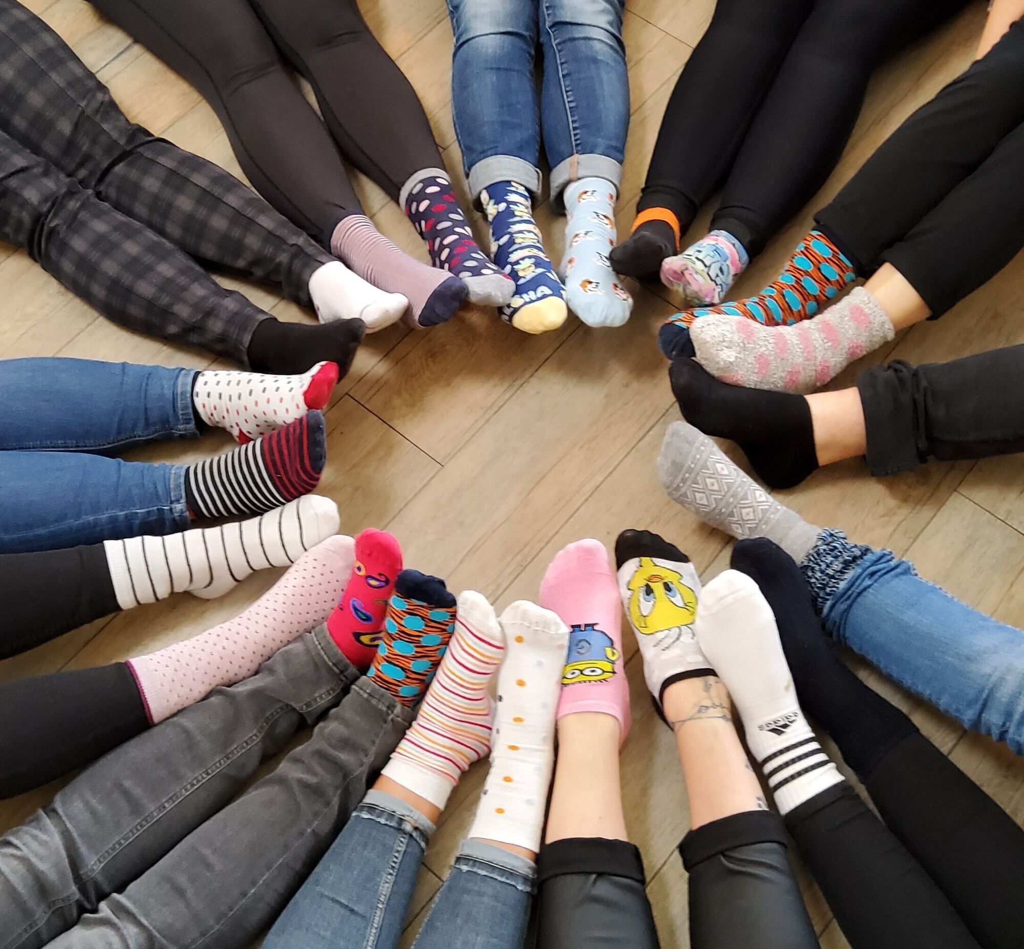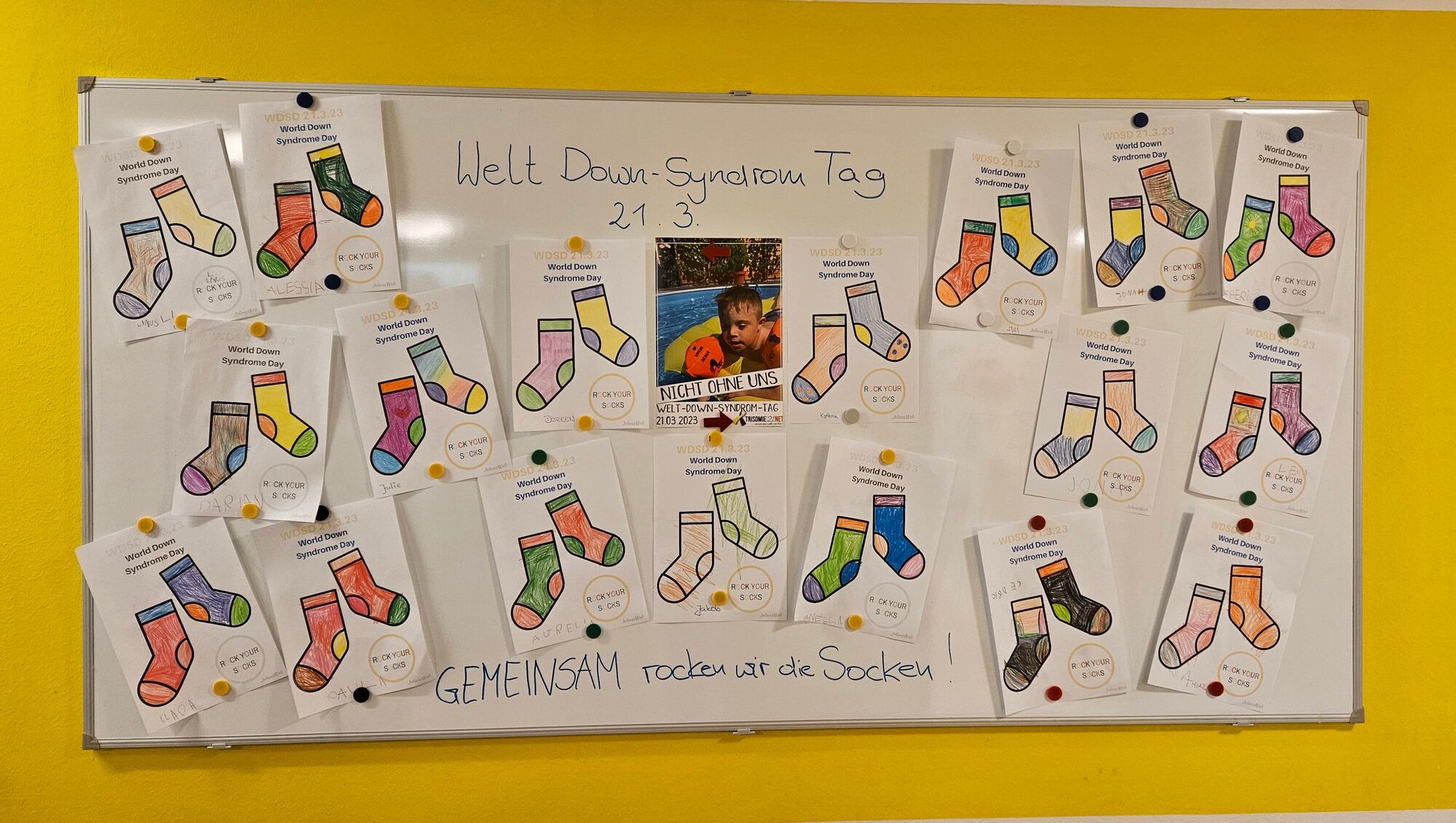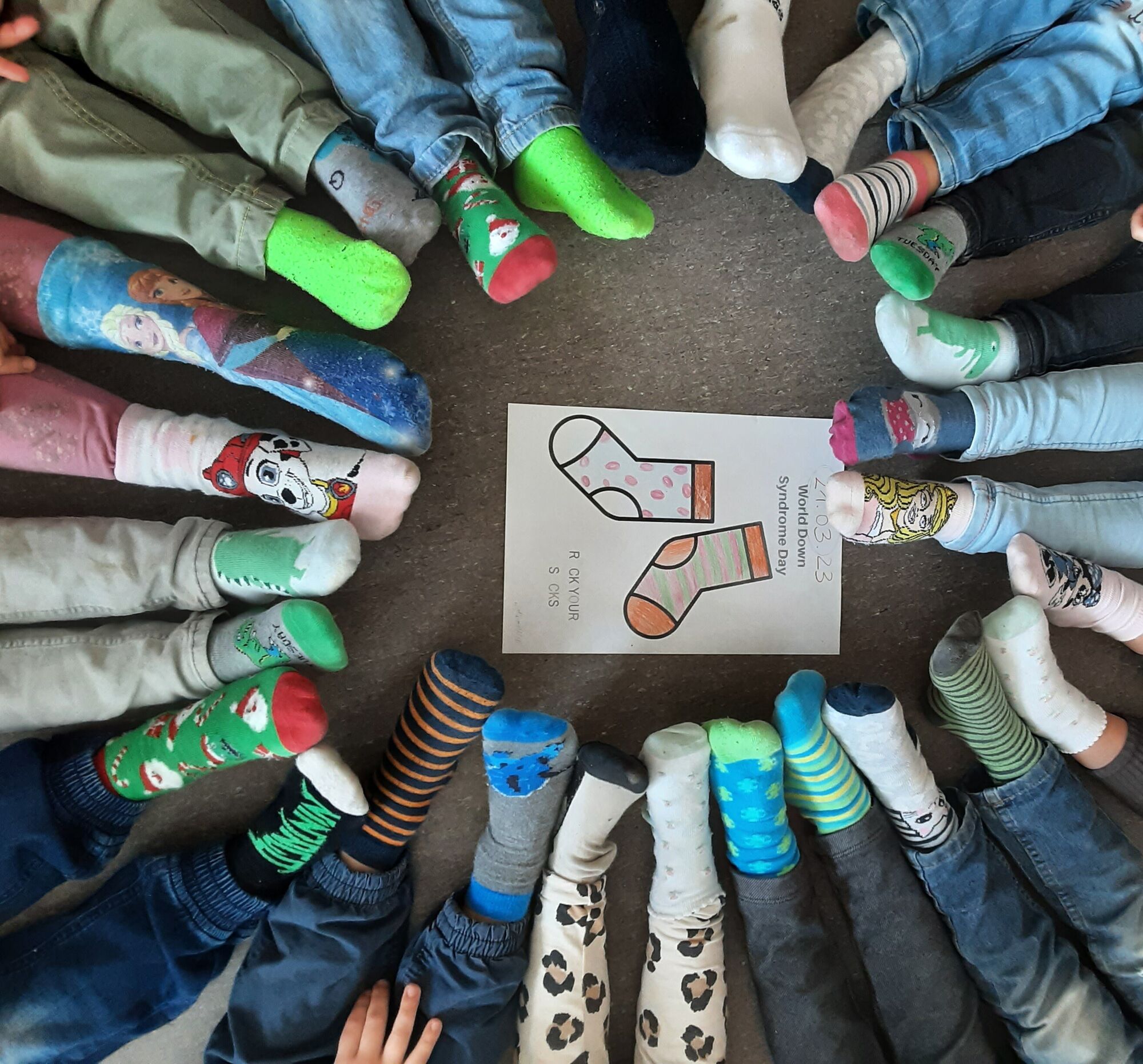 Der Welt-Down-Syndrom-Tag am 21. März war in diesem Jahr auf sehr bunte Weise in unserer Kita sichtbar. Auf der ganzen Welt wird an diesem Tag auf das Leben der Menschen mit Down-Sydrom aufmerksam gemacht. Dank der Initiative der Erzieherinnen und Mama eines Kindes mit Down-Syndrom aus der Kindergartengruppe „Lachmöven“, stand der Tag traditionell unter dem Motto bunter unterschiedlicher Socken. Mit bunten, lustigen und verrückten Socken an den Füßen und vielen bunt angemalten Socken-Paaren in der Kita, wurde mit viel Spaß ein Zeichen für die Akzeptanz und Schönheit der Unterschiede und Vielfalt gesetzt.